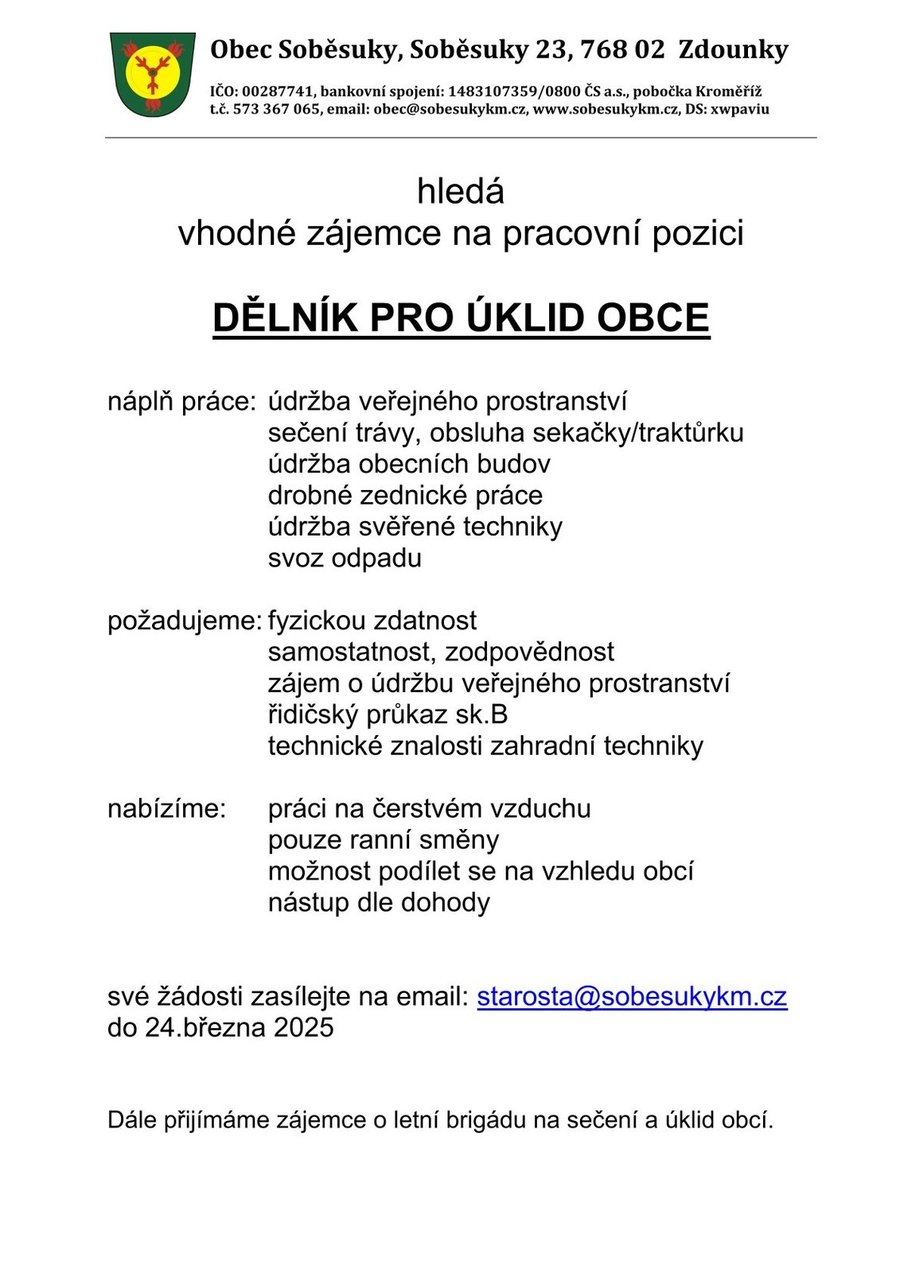 Úvod > O obci > Aktuality > Obec Soběsuky - inzerát na pozici dělník pro úklid obce