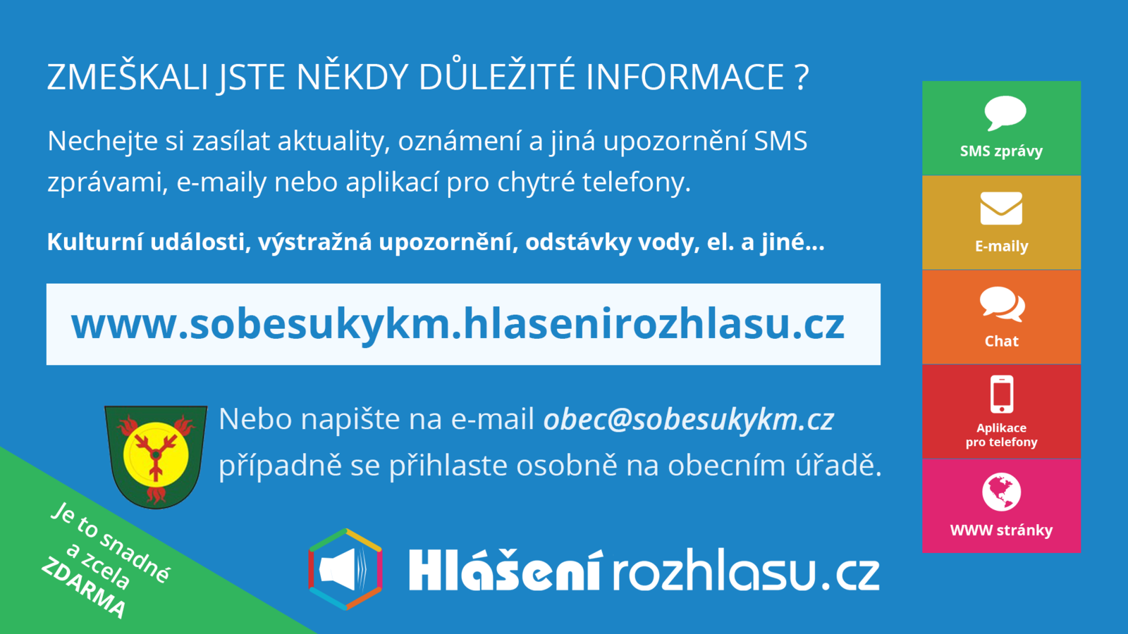 Úvod > O obci > Aktuality > Zasílání aktualit, novinek, hlášení rozhlasu