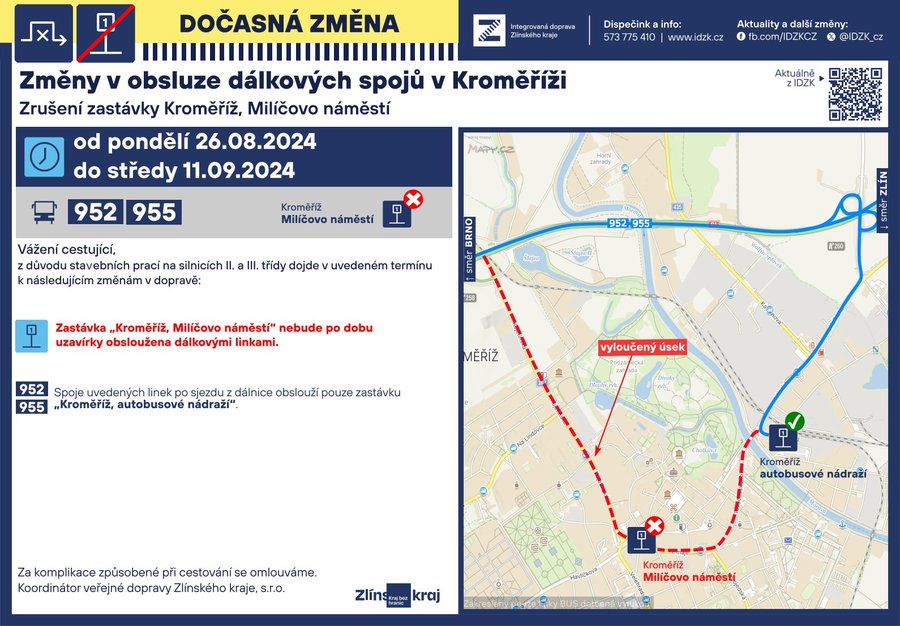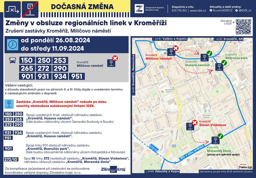 Úvod > O obci > Aktuality > Změna v obsluze autobusových linek - zrušení zastávky Milíčovo nám. Kroměříž